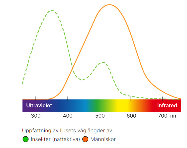 I vårt sortiment från BEGA finns utomhusarmaturer med en färgtemperatur på 2700 eller 2200 Kelvin som standard. På förfrågan kan vi även leverera de allra flesta armaturer med andra färgtemperaturer och med tillvalet BEGA BugSaver®. Detta ljus är specialdesignat för att i möjligaste mån helt undvika våglängder inom det blåa spektrumet. Ljuset upplevs amberfärgat och kan närmast liknas vid varmt ljus med en färgtemperatur på 1800 Kelvin. För en god mänsklig upplevelse kombineras det amberfärgade ljuset med en varmvitt ljus på 3000 Kelvin. Växlingen mellan ljusfärgerna sker långsamt och steglöst över tid med en automatik som tillser att behovet för stunden premieras. Ett varmvitt ljus för människor de tider vi främst är i rörelse och ett amberfärgat ljus kvälls- och nattetid när få människor nyttjar platsen.