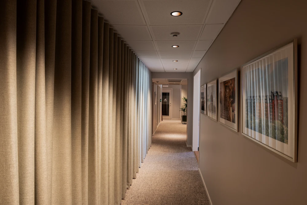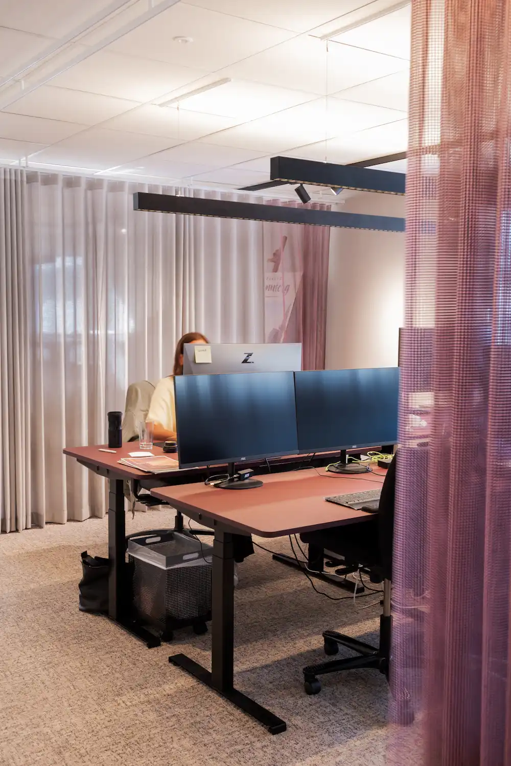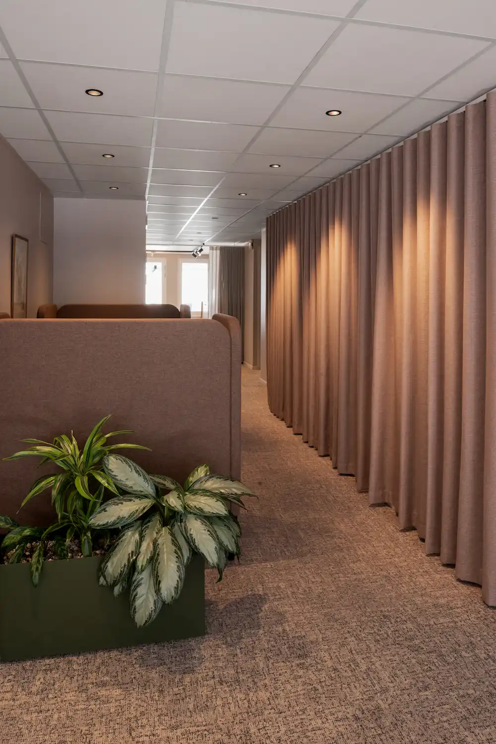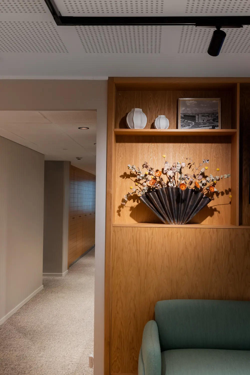 Rummen präglas av dämpade kulörer, naturliga material och taktila ytor, och ljuset följer samma mjuka linje. I öppna arbetsytor och korridorer skapar ILO och Sonnos en behaglig allmänbelysning, medan riktbara spotlights från BEGA lyfter fram detaljer som exempelvis den karaktäristiska växtväggen med stor precision. Kombinationen av direkt och indirekt ljus ger en välbalanserad ljusmiljö som både stödjer koncentration och ger plats för pauser.