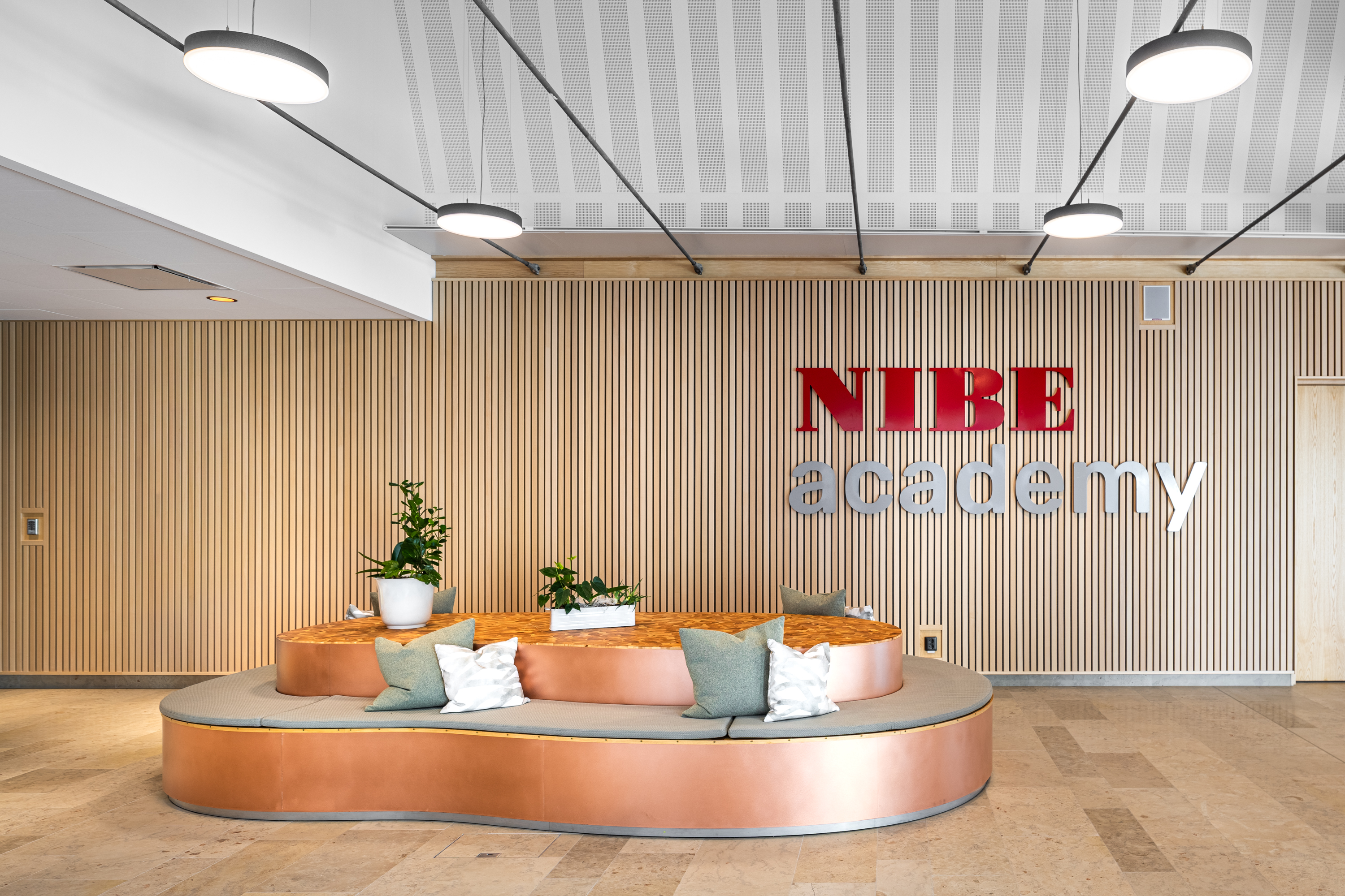 I projektet har även belysningens materialitet fått en tydlig koppling till NIBEs egen produktvärld. För armaturen Sonnos togs en specialkulör fram; en mörkare, patinerad kopparton som knyter an till företagets VVS-produkter.