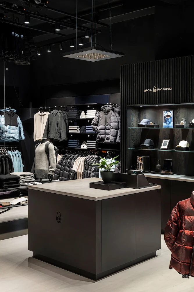 När Sailracing öppnade sin nya butik på Kungsgatan fanns en klar ambition, miljön skulle vara inbjudande och intressant utan att stjäla uppmärksamheten från kläderna. Med svarta väggar och tak som utgångspunkt blev ljuset en bärande komponent i gestaltningen.