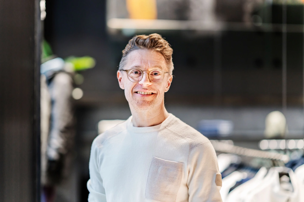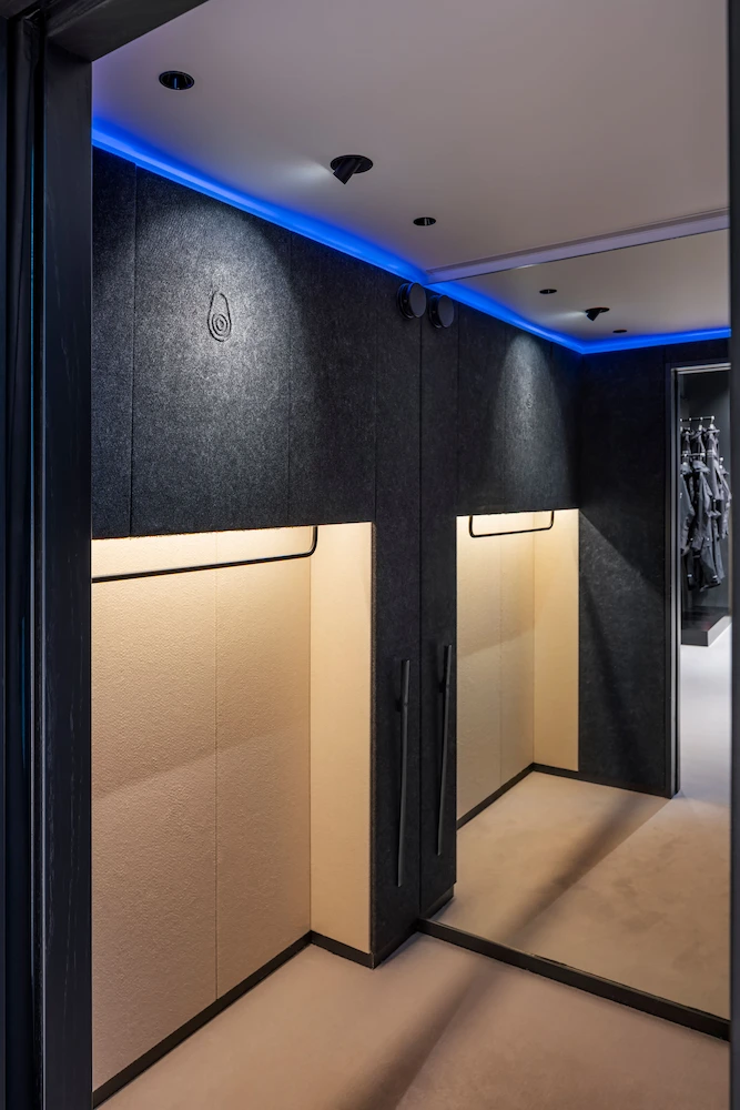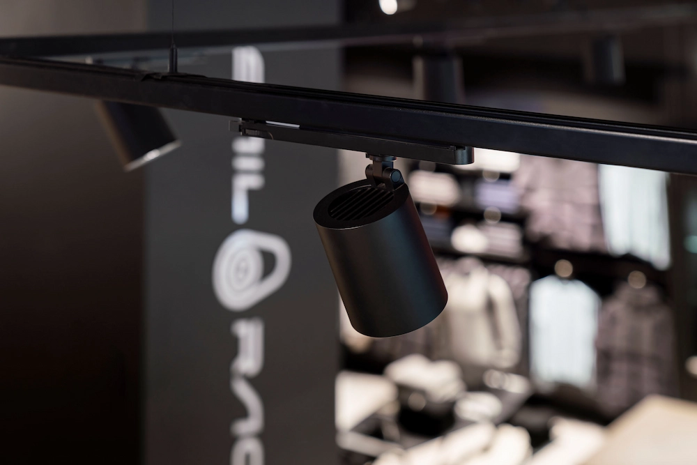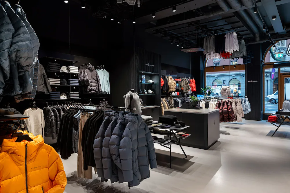 En stor del av Sailracings kläder är mörka och Petters idé var tydlig, vi gör en svart lokal till våra svarta kläder, då blir ljuset avgörande för att lyfta fram produkterna. Det här blev utgångspunkten för samarbetet med Annell, att hitta rätt typ av belysningslösning för att framhäva produkterna i en lokal där svarta väggar och tak bryts av med ett ljust golv.